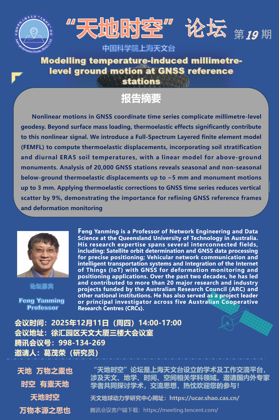 Modelling temperature-induced millimetre-level ground motion at GNSS reference stations 冯延明教授 澳大利亚昆士兰科技大学 2025, Dec 11, "Astro-geodynamics Forum (No. 19)" invites Professor Yanming Feng of Queensland University of Technology to give a plenary talk on "Modelling temperature-induced millimetre-level ground motion at GNSS reference stations". |