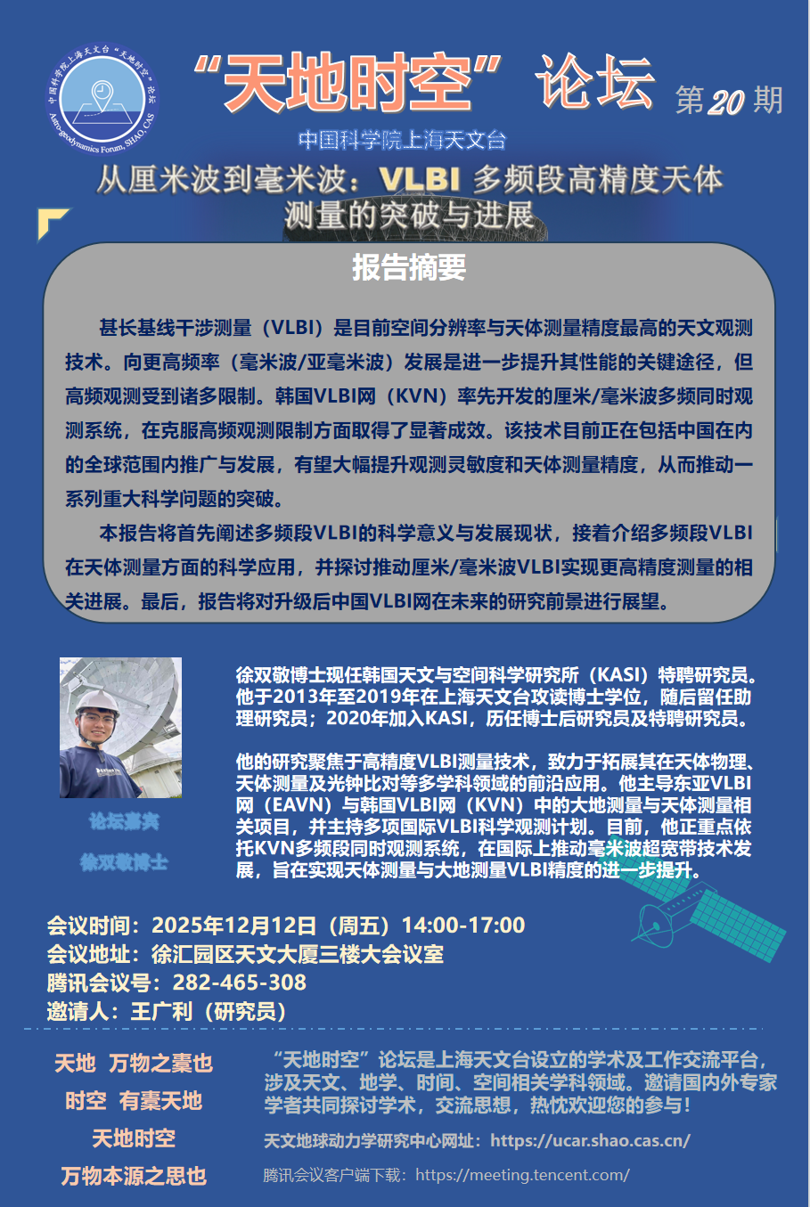从厘米波到毫米波:VLBI 多频段高精度天体测量的突破与进展 徐双敬博士 韩国天文与空间研究所 2025, Dec 11, "Astro-geodynamics Forum (No. 20)" invites Doctor Shuangjing Xu of Korea Astronomy and Space Science Institute to give a plenary talk on "From Centimeter to Millimeter Waves: Breakthroughs and Advances in Multi-Band High-Precision Astrometry with VLBI". |